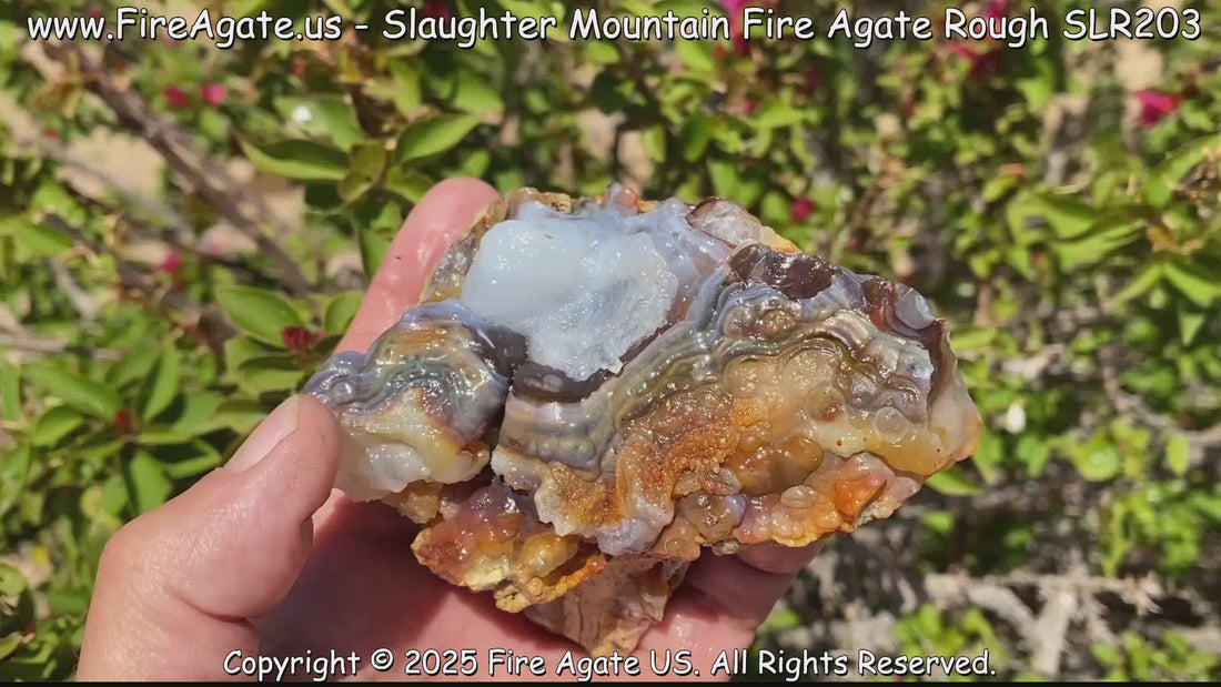Following is an example piece of high quality Slaughter Mountain Fire Agate Rough (SLR203) with before and after images.